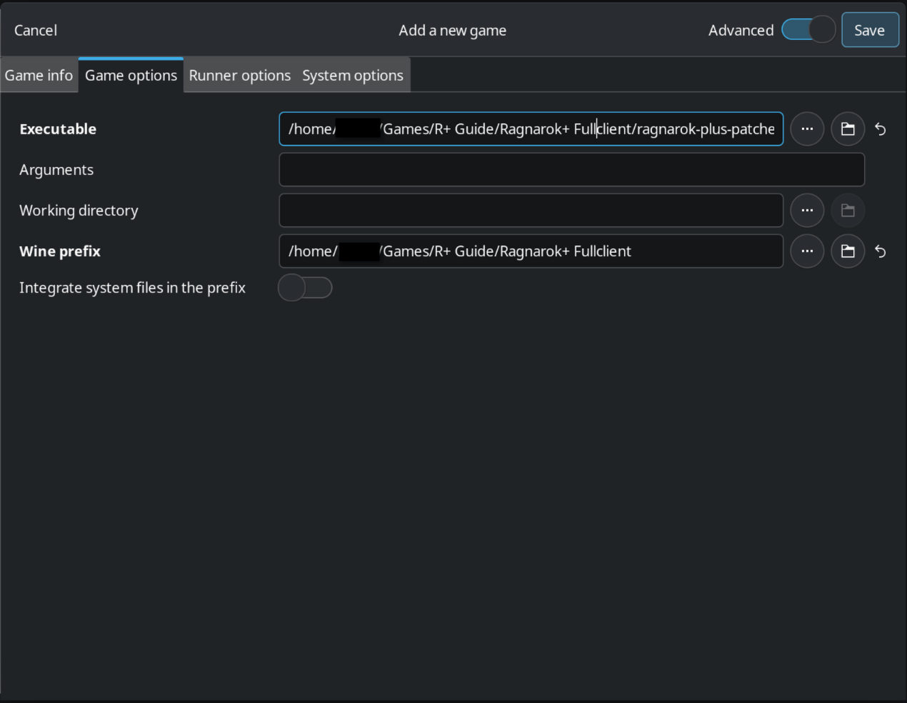 4. In the "Game options" tab, point the Executable to ragnarok-plus-patcher.exe located in the folder you extracted Ragnarok+ to earlier. Select the Wine Prefix to either be the same folder as your Ragnarok+ directory (if you plan on using only the prefix for Ragnarok+) or to a different directory (if you plan on using the prefix for multiple games.) The rest of the fields may be left blank.